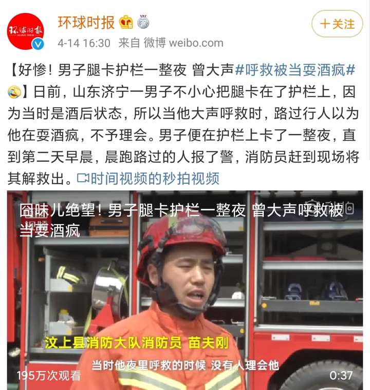 男子腿卡护栏一整夜 大声呼救被当耍酒疯
