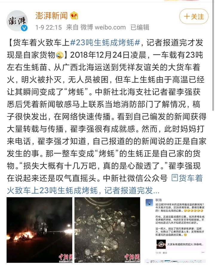 货车着火23吨生蚝被烧 记者报道完发现是自家货物